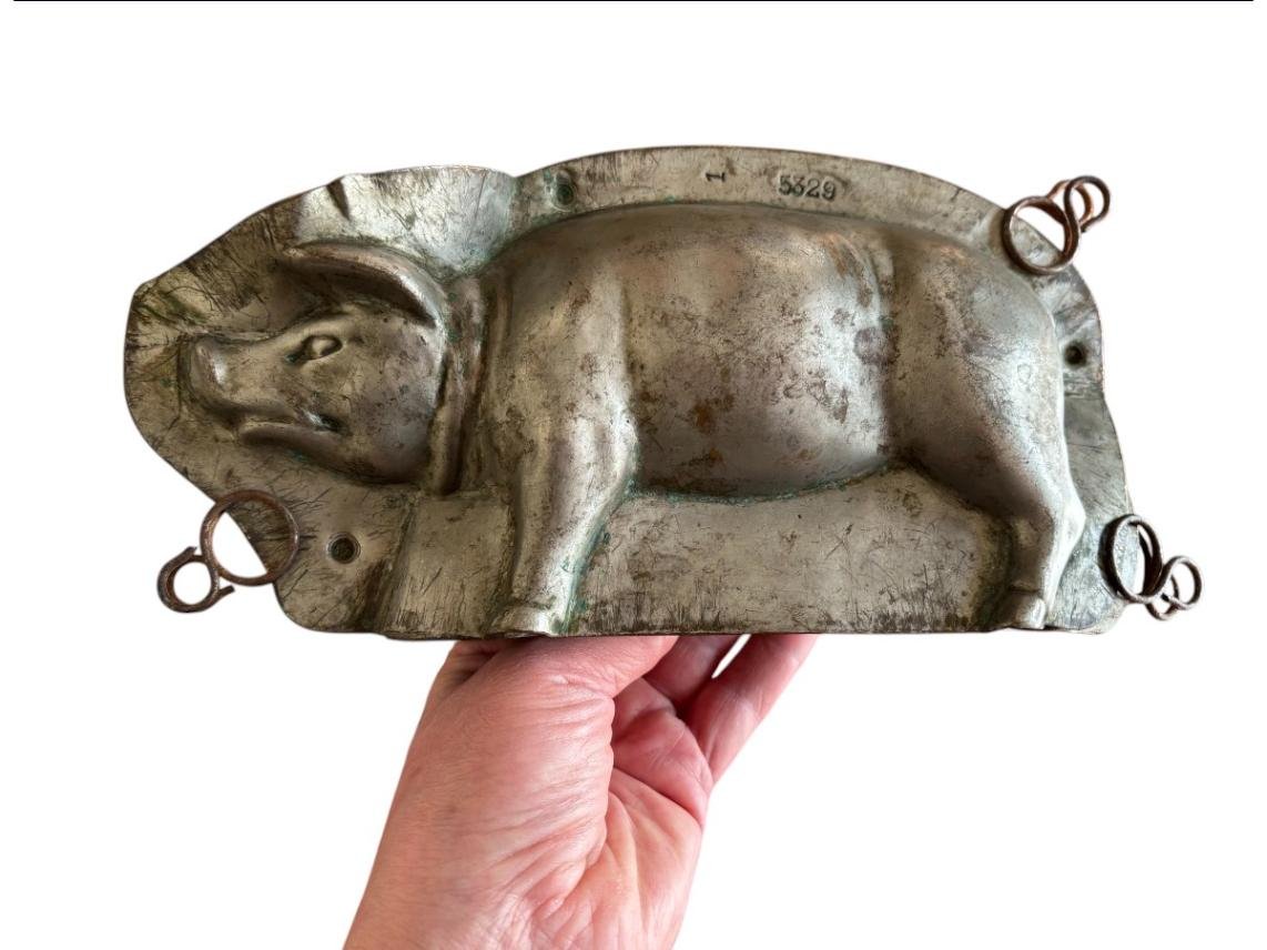 Antique chocolate mold of a pig made in Germany circa 1930.Walking or standing pig mold numbered 5329. Good luck pig probably made by Laurösch.For the collector of antique chocolate molds, gadget for chocolatier or butcher, pig collectible item.
