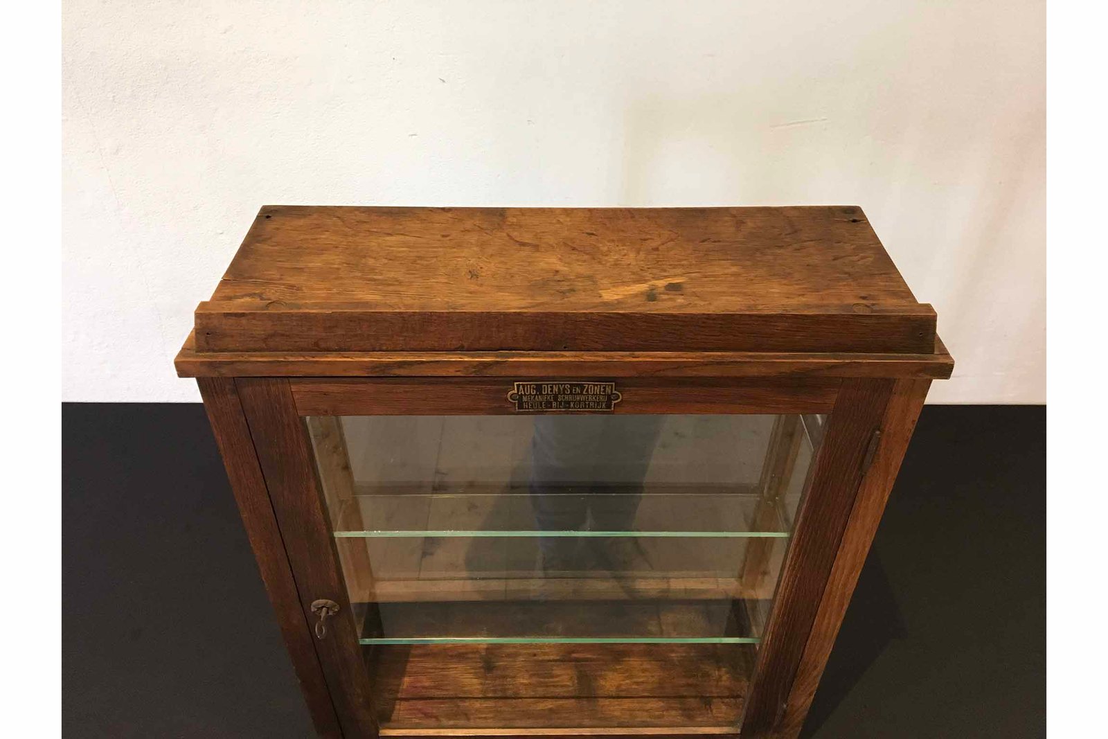 Hout met glas toonbank vitrine. Een vintage kleine vitrine met volledig glas rondom. Werd gemaakt door Aug.Denys en Zonen – Mekanieke Schrijnwerkerij – Heule bij Kortrijk België. Een mooi kastje – vitrientje – vitrinetje om kleine items uit te stallen zoals kleine blikjes, kristal, miniatuur auto’s, parfumflesjes, drankflesjes etc ….