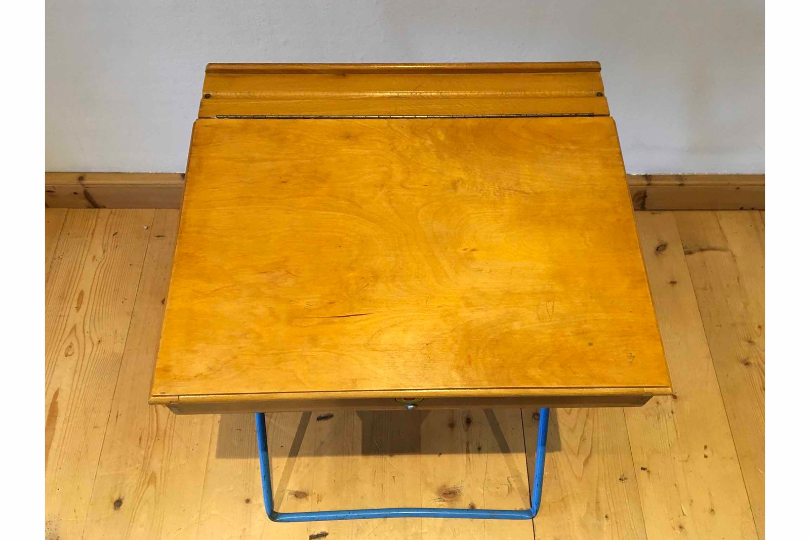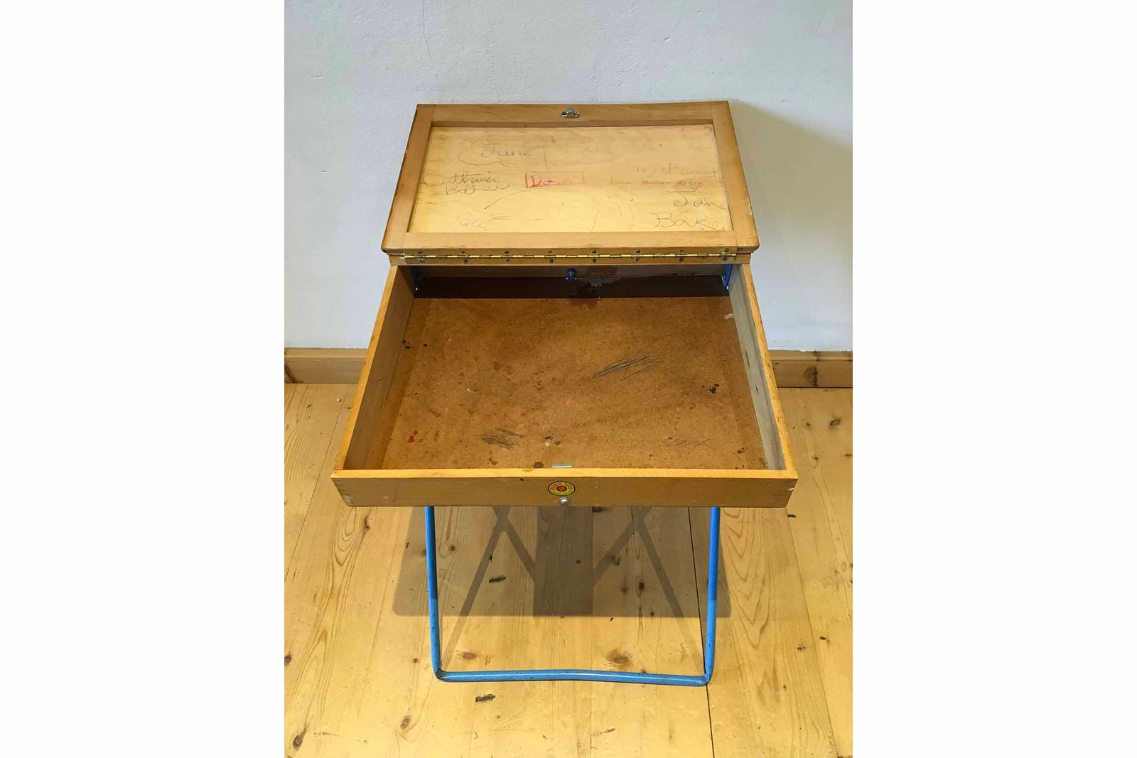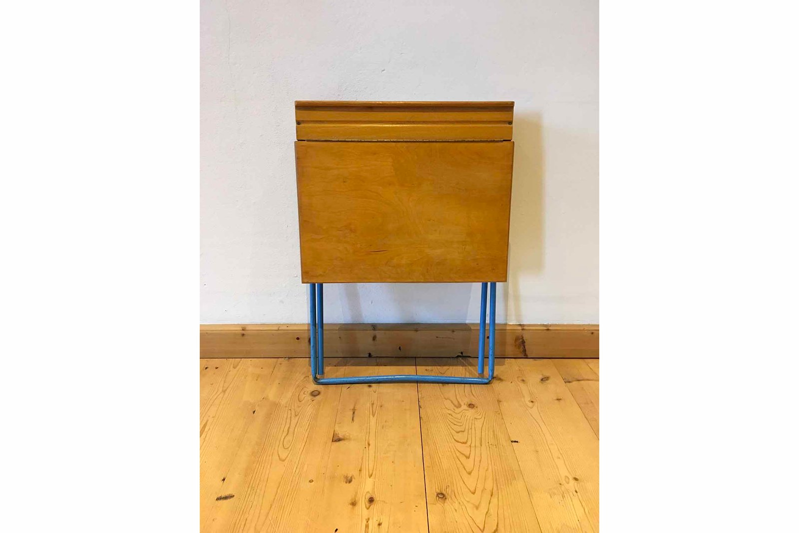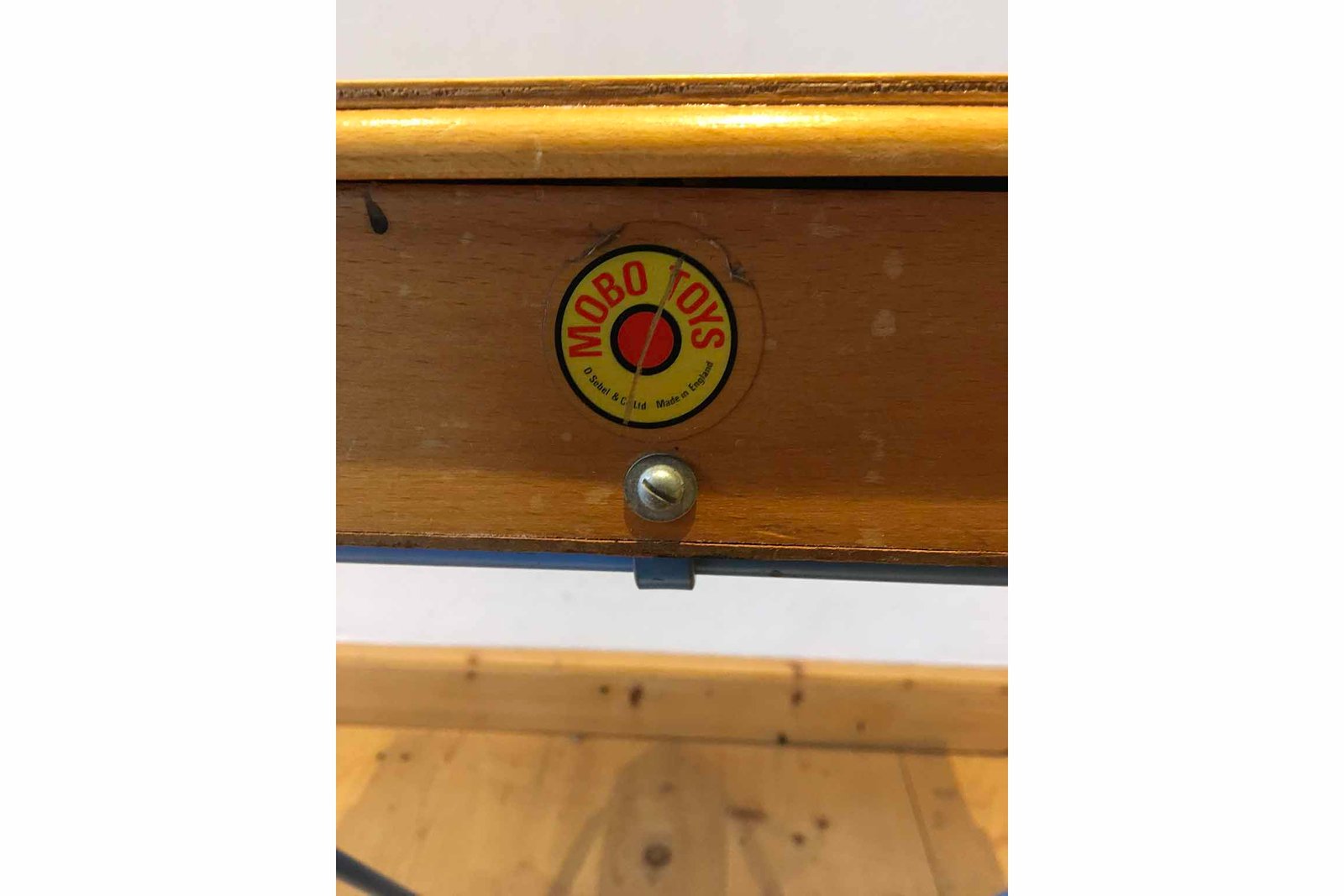 Mobo Toys bureau voor kinderen. Een houten kinderbureau op metalen frame met binnenin plaats om spullen op te bergen. Je kan de poten dichtklappen waardoor deze makkelijk aan de kant of weg te zetten is. Dus ook handig om mee te nemen in de auto, ,op reis, mee met de camper etc …Een vintage kinderbureautje – kindertafeltje uit de Jaren 50 gemaakt door Mobo Toys D Sebel & Co Ltd – Made in England.