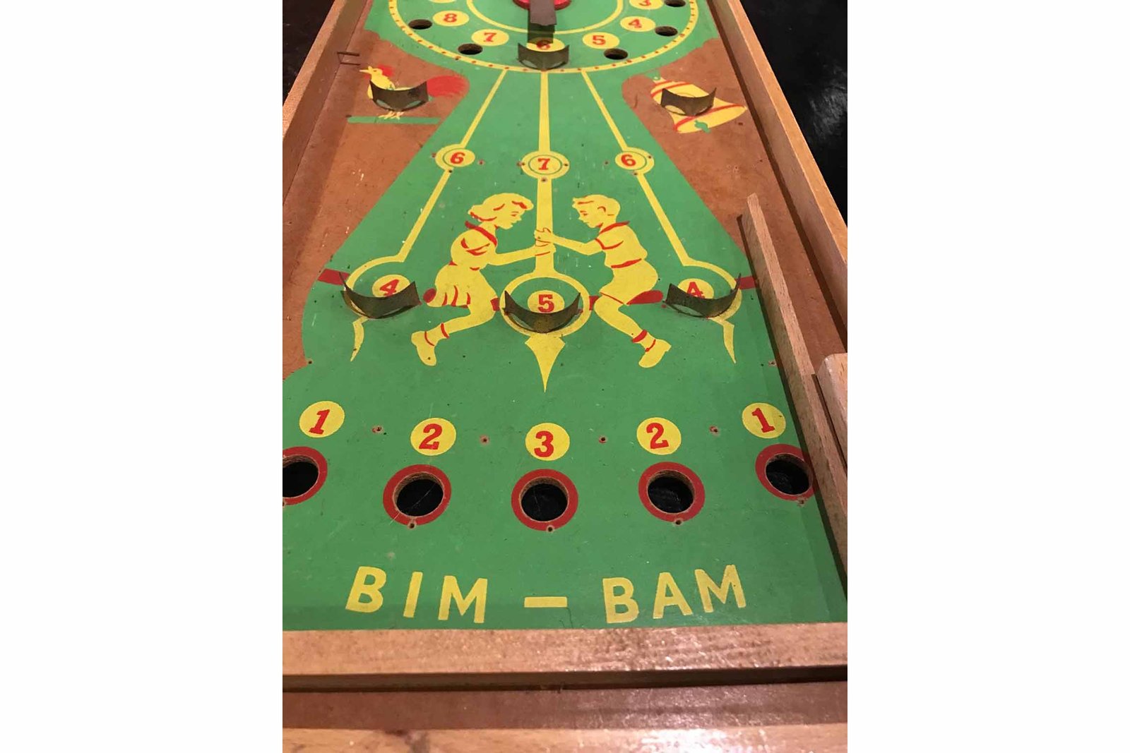 Vintage wooden tabletop pinball game or flipper game. A vintage wooden game where you could play with little balls or marbles – comparable with a large pinball machine. The design of this vintage game – vintage toy is a bright green clock with children sitting on the clock pointer. That’s why the game is called bim bam as the pointer in real life goes from the left to the right and makes the typical bim bam sound. Further you also see a chicken and a bell. No balls or marbles with the game. Also great wall decoration for a child’s room or for a vintage game room.